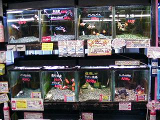 当店の金魚コーナーです。この水槽の下にはらんちゅうなどがいまーす